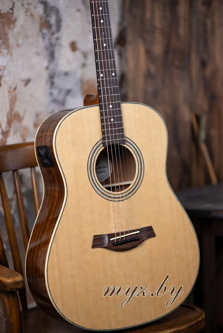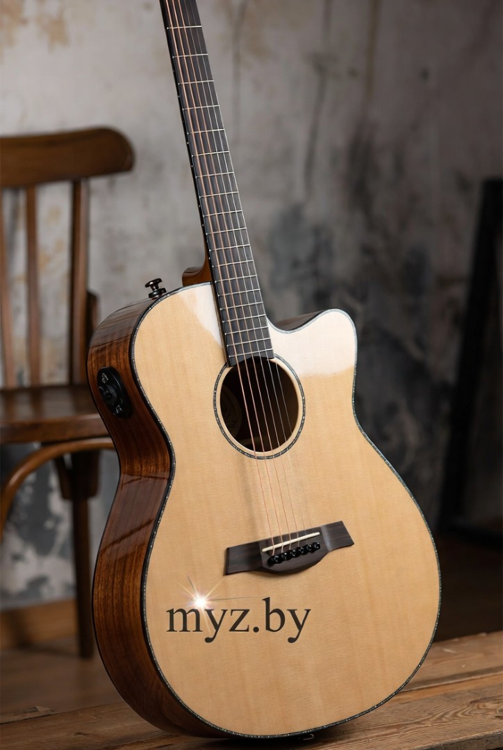 Глянцевый натуральный финиш подчёркивает красивую текстуру дерева — выглядит премиально, элегантно и с настоящим «мастеровым» вайбом. Черепаховый пикгард защищает деку, перламутровая розетка и инкрустации на грифе добавляют винтажной изысканности. Гриф из махагони с накладкой из палисандра и скаллопированной X-bracing лежит в руке идеально — slim-профиль, радиус 16", ширина порожка 43 мм делают игру комфортной даже часами. 20 ладов, закрытые колки держат строй стабильно, регулируемый анкер позволяет точно настроить инструмент под себя.
